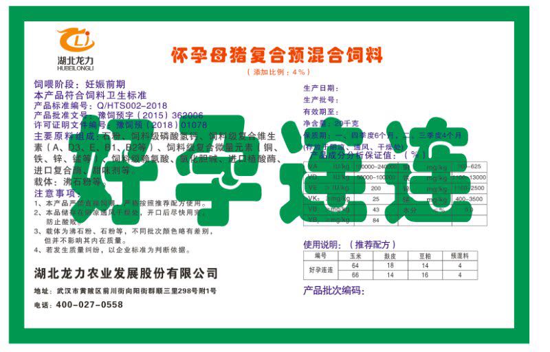 湖北龍力農(nóng)業(yè)發(fā)展股份有限公司坐落于武漢市黃陂區(qū)前川街向陽街群順三里298號附1號。公司成立于2014年6月,公司自成立以來把“創(chuàng)全球最大養(yǎng)豬綜合服務”為企業(yè)愿景。致力于打造教保料品牌”作為公司發(fā)展的明確目標。公司一直致力于豬營養(yǎng)的研究和開發(fā),積極與國內(nèi)外高校和科研機構(gòu)合作,推廣養(yǎng)豬技術(shù)、動物營養(yǎng)新概念,向世界農(nóng)牧企業(yè)學習與合作。公司采用國內(nèi)先進的生產(chǎn)工藝,選擇高精度電子配料秤,高均勻度、無殘留混合機等先進設備....